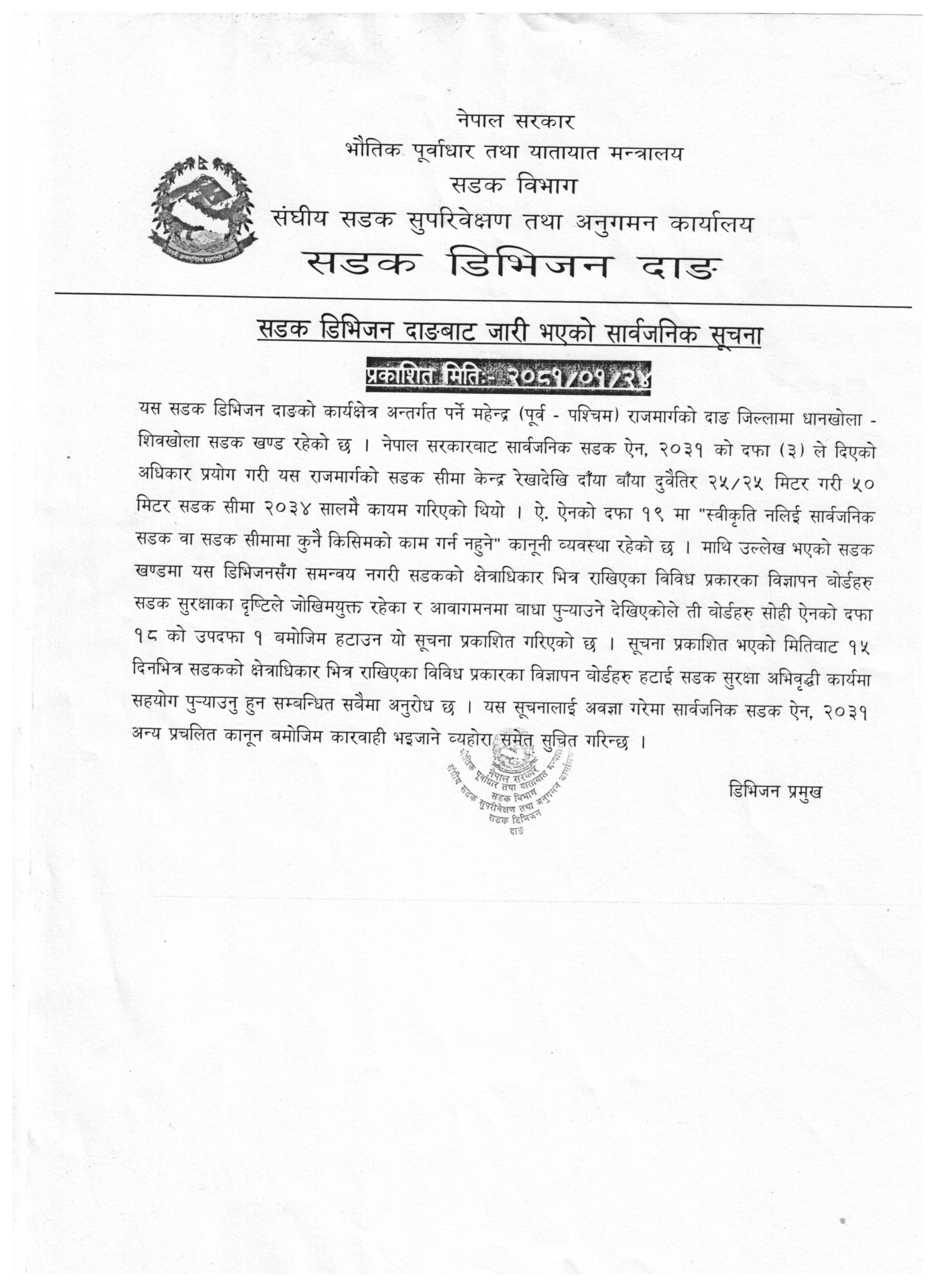 सडक डिभिजन कार्यालयकाे अत्यन्त जरुरी सुचना